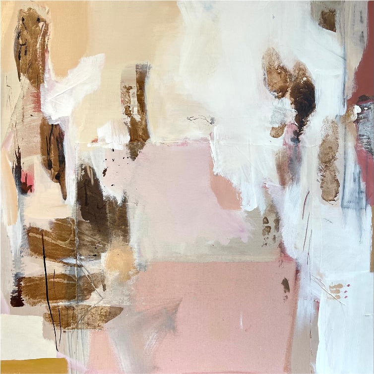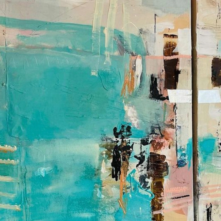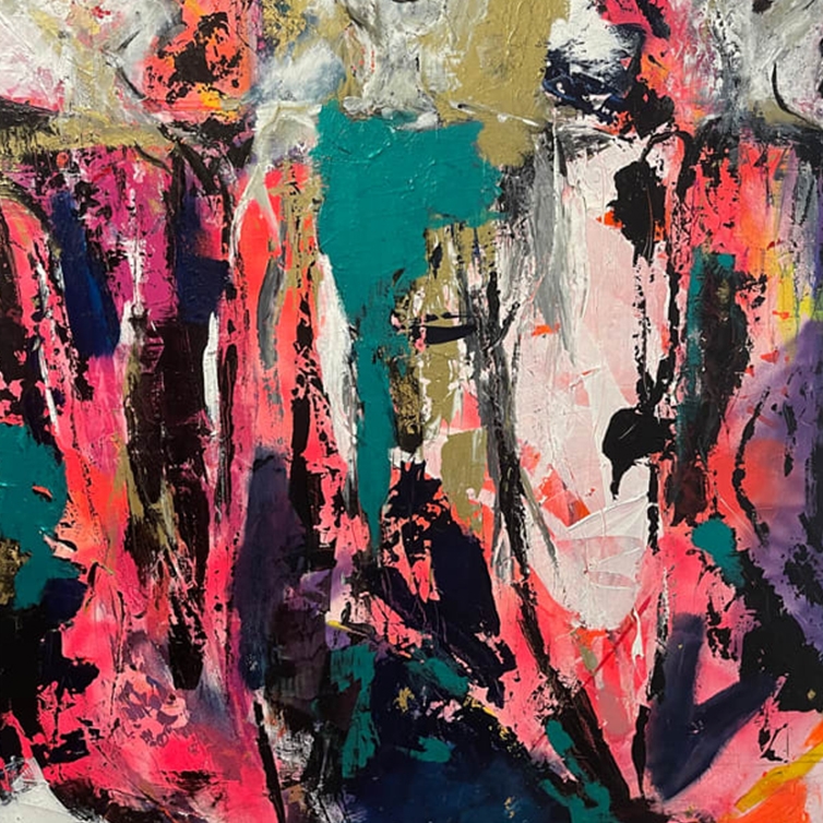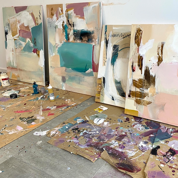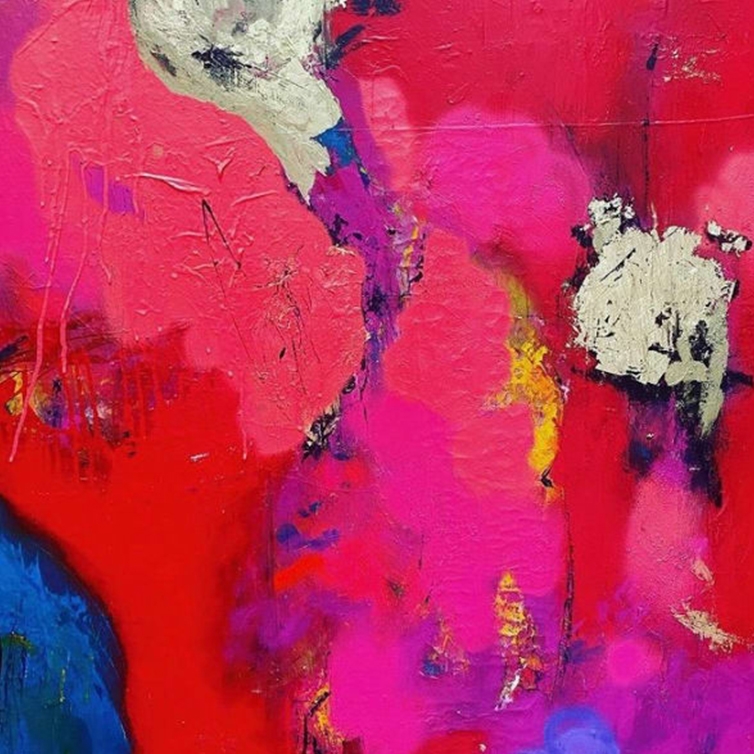 I am drawn to abstract art, my compositions leave ample room for interpretation by the viewer and are non-prescriptive – they can be different things to different people, anything for anyone. The production process is messy with loud music and flying paint. It makes me feel free and content.